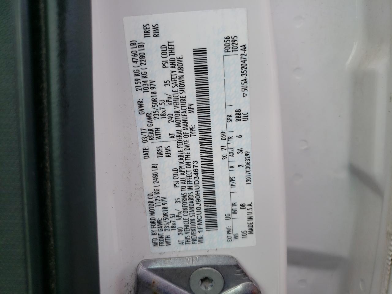 2017 FORD ESCAPE - 1FMCU0J90HUD34673, колір - Білий, 2.0, Бензин, із США