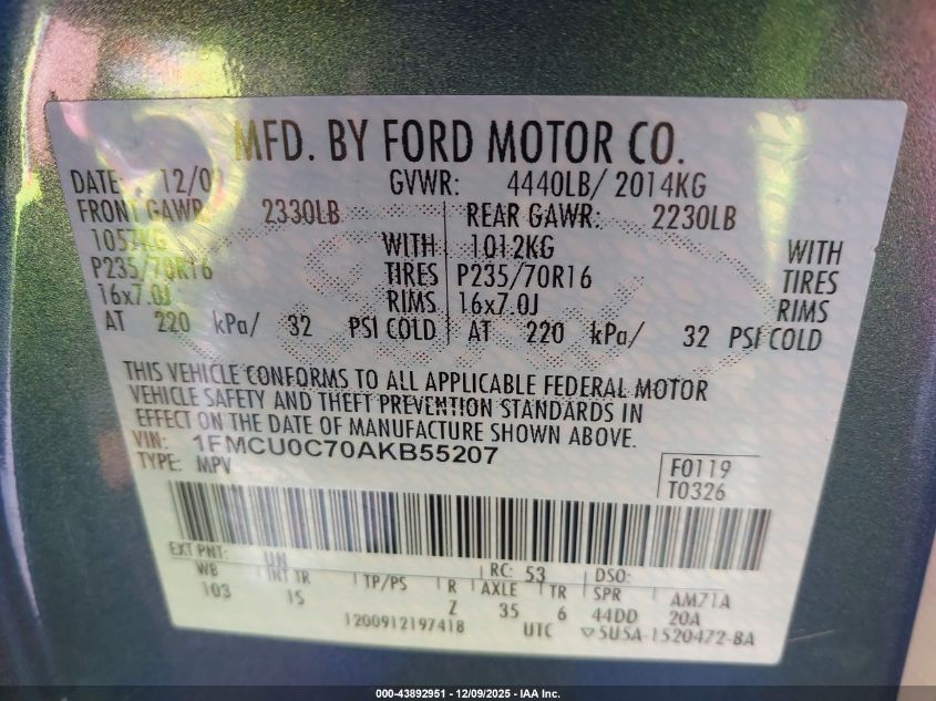 Колір СинійЦиліндри 4Привід Передній привідVIN 1FMCU0C70AKB55207Стан СтаціонарноУшкодження Механічні пошкодження
