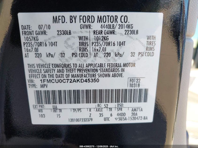 Колір ЧорнийЦиліндри 4Привід Передній привідVIN 1FMCU0C72AKD45350Стан Заводиться та їде (перевірено)Ушкодження Передня або задня