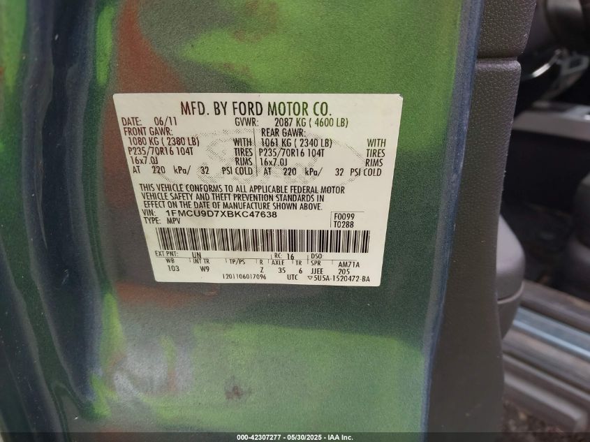 Колір СинійЦиліндри 4Привід Повний привідVIN 1FMCU9D7XBKC47638Стан СтаціонарноУшкодження Звичайний знос