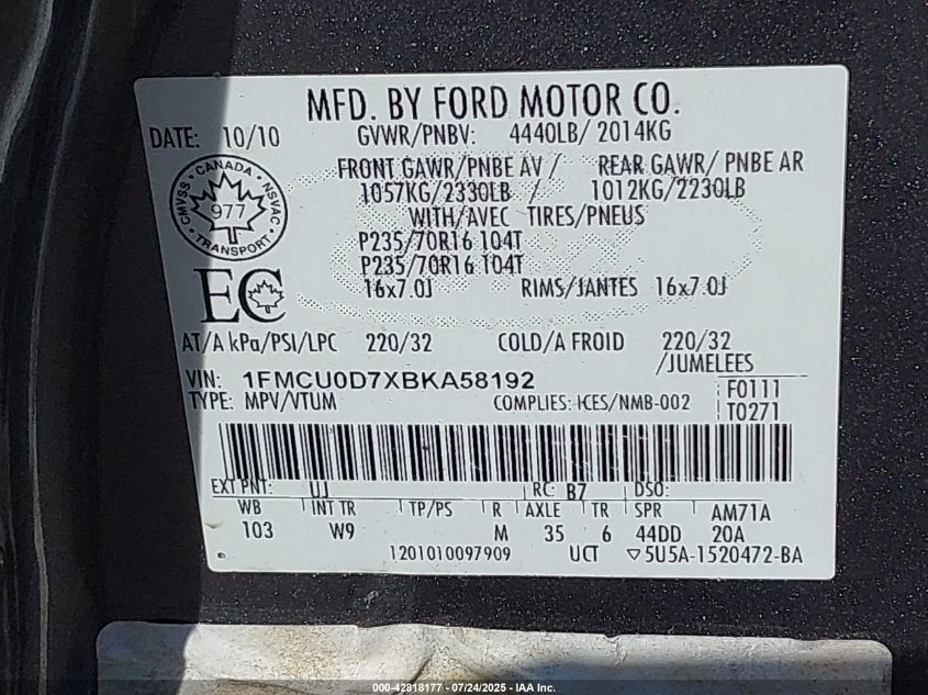 Колір СрібнийЦиліндри 4Привід Передній привідVIN 1FMCU0D7XBKA58192Стан СтаціонарноУшкодження Права сторона