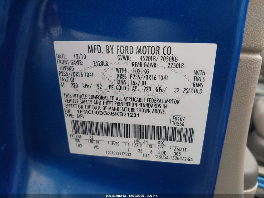 2011 FORD ESCAPE - 1FMCU0DG3BKB21231, колір - Синій, 3.0, Бензин, Передній привід із США