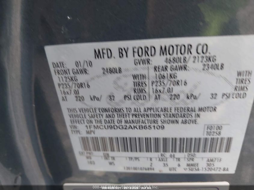 Колір СинійЦиліндри 6Привід Повний привідVIN 1FMCU9DG2AKB65109Стан НевідомоУшкодження Передня або задня