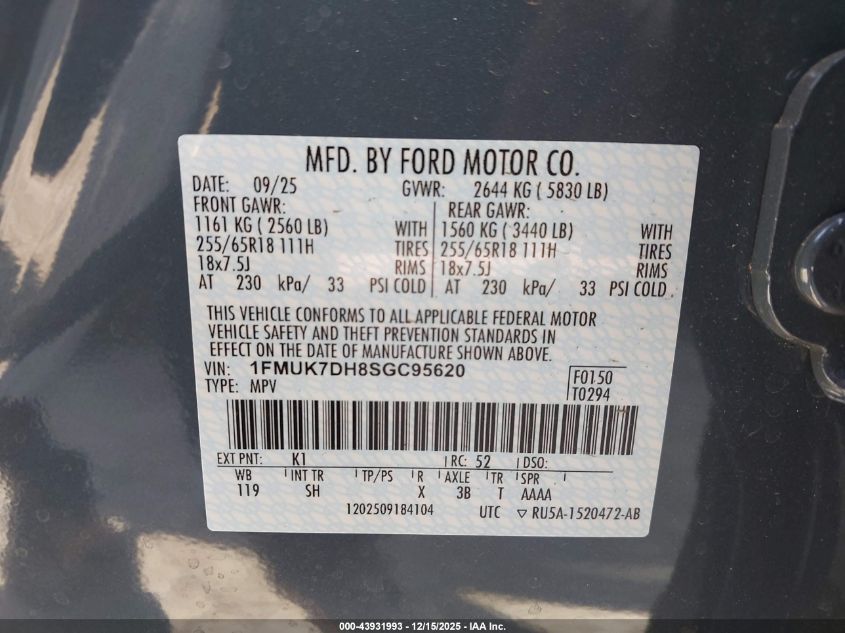 Колір СинійЦиліндри 4VIN 1FMUK7DH8SGC95620Стан Заводиться та їде (перевірено)Ушкодження Задня ліва