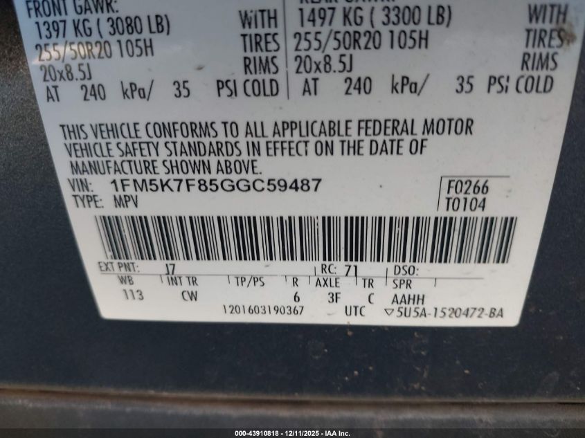 2016 FORD EXPLORER - 1FM5K7F85GGC59487, колір - Сірий, 3.5, Бензин, Передній привід із США