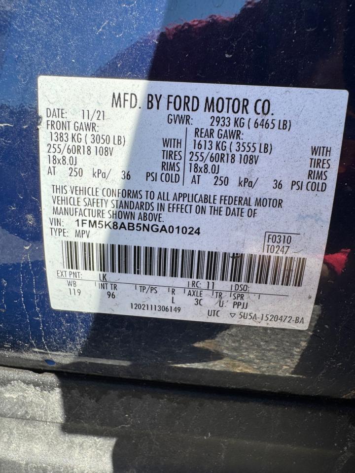 Колір СинійЦиліндри 6Привід 4x4 з заднім приводомVIN 1FM5K8AB5NGA01024Стан Заводиться та їде (перевірено)Ушкодження НезначніДата аукціона 2025-10-08