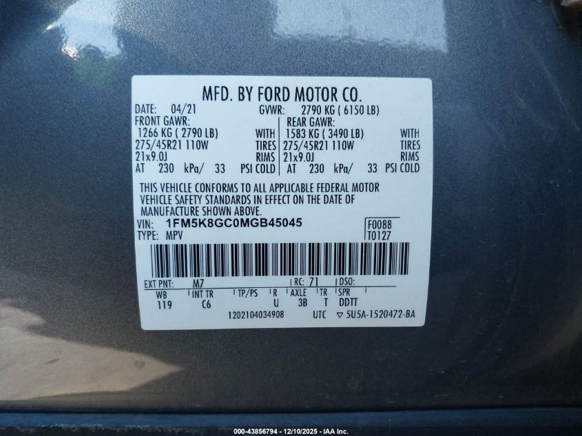 Колір СірийЦиліндри 6Привід Повний привідVIN 1FM5K8GC0MGB45045Стан ЗаводитьсяУшкодження Незначні