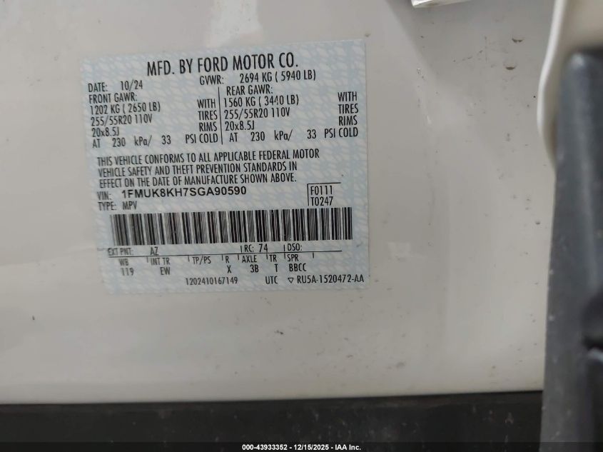 2025 FORD EXPLORER - 1FMUK8KH7SGA90590, колір - Білий, 2.3, Бензин, Повний привід із США