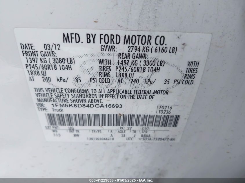 Колір БілийЦиліндри 6Привід Повний привідVIN 1FM5K8D84DGA16693Стан Заводиться та їде (перевірено)Ушкодження Права сторона