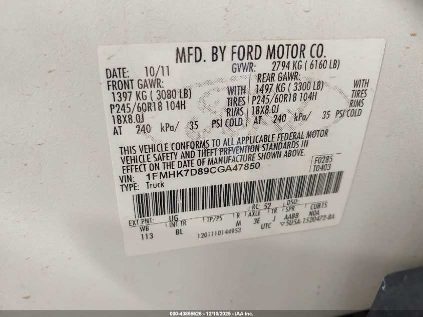 Колір БілийЦиліндри 6Привід Передній привідVIN 1FMHK7D89CGA47850Стан Заводиться та їде (перевірено)Ушкодження Права сторона