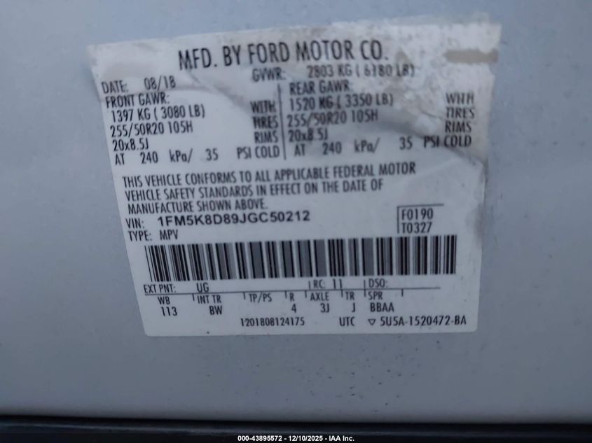 Колір БілийЦиліндри 6Привід Повний привідVIN 1FM5K8D89JGC50212Стан СтаціонарноУшкодження Передня або задня