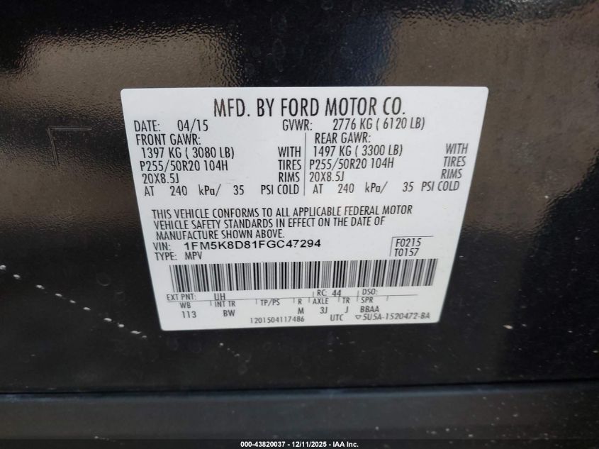 Колір ЧорнийЦиліндри 6Привід Повний привідVIN 1FM5K8D81FGC47294Стан Заводиться та їде (перевірено)Ушкодження Передня або задня