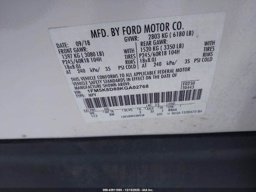 Колір БілийЦиліндри 6Привід Повний привідVIN 1FM5K8D89KGA02768Стан Заводиться та їде (перевірено)Ушкодження Передня і задня