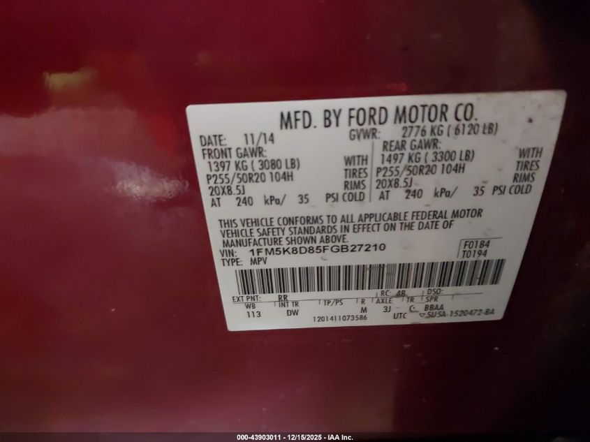 Колір ЧервонийЦиліндри 6Привід Повний привідVIN 1FM5K8D85FGB27210Стан СтаціонарноУшкодження Задня