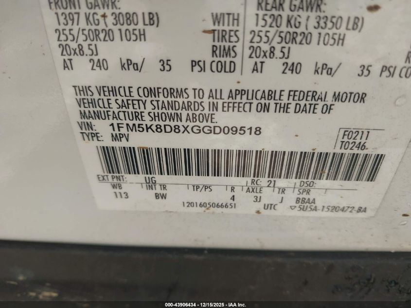 Колір БілийЦиліндри 6Привід Повний привідVIN 1FM5K8D8XGGD09518Стан Заводиться та їде (перевірено)Ушкодження Передня або задня