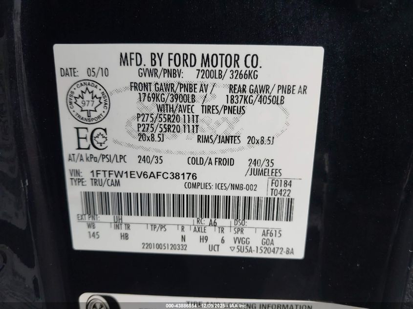 2010 FORD F-150 - 1FTFW1EV6AFC38176, колір - Чорний, 5.4, Бензин, Повний привід із США