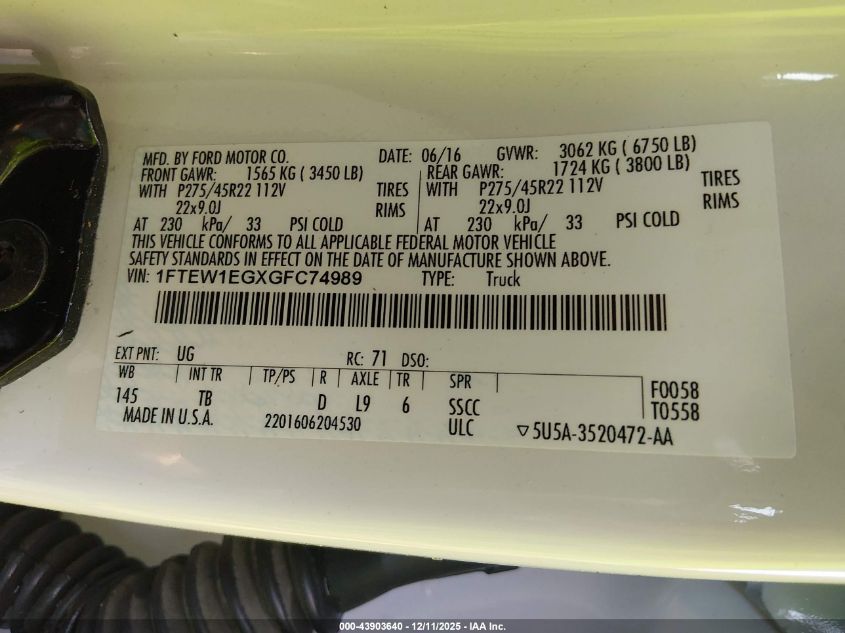 2016 FORD F-150 - 1FTEW1EGXGFC74989, колір - Білий, 3.5, Бензин, Повний привід із США