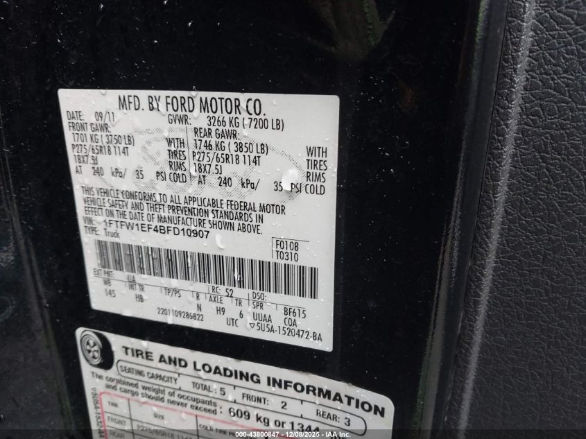 Колір ЧорнийЦиліндри 8Привід Повний привідVIN 1FTFW1EF4BFD10907Стан СтаціонарноУшкодження Задня
