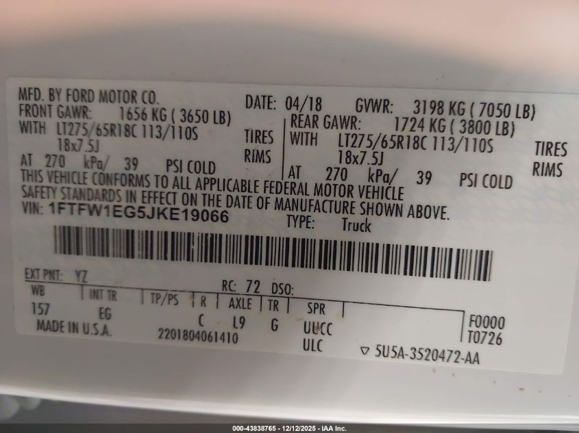 Колір БілийЦиліндри 6Привід Повний привідVIN 1FTFW1EG5JKE19066Стан СтаціонарноУшкодження Передня або задня