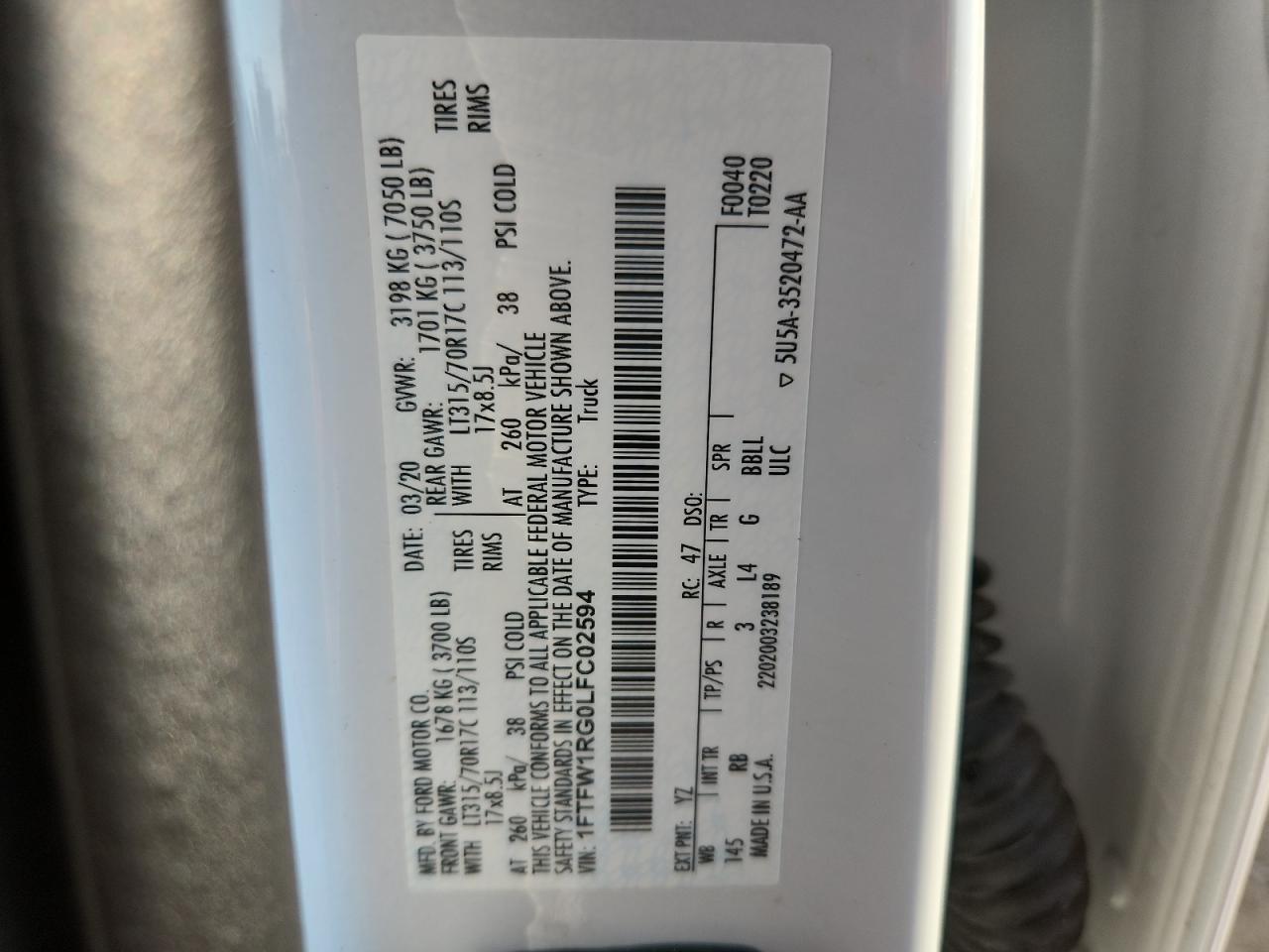 Колір БілийЦиліндри 6Привід 4x4 з заднім приводомVIN 1FTFW1RG0LFC02594Стан ЗаводитьсяУшкодження З боків