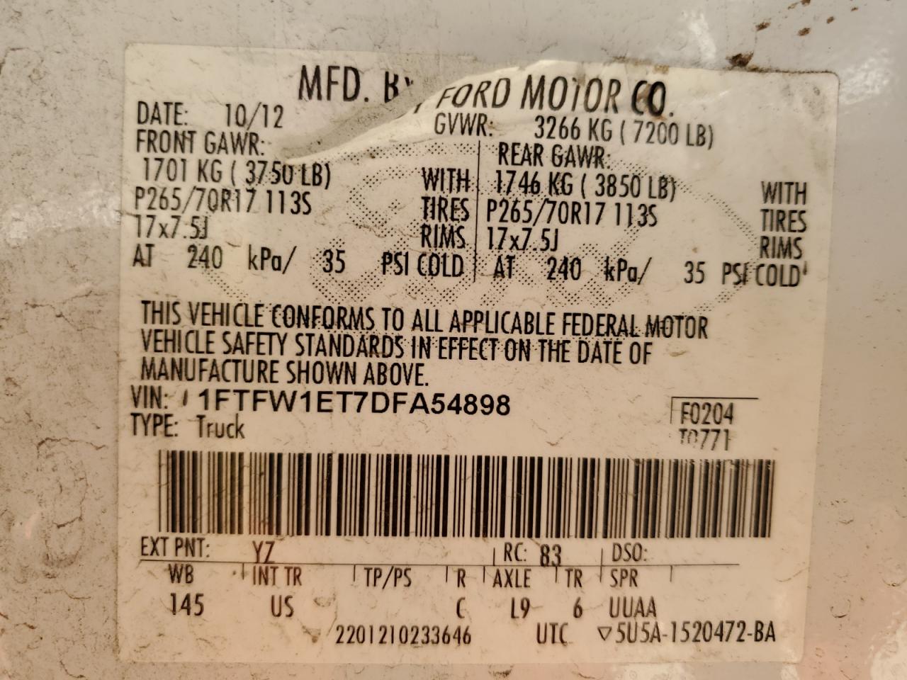 Колір БілийЦиліндри 6Привід 4x4 з заднім приводомVIN 1FTFW1ET7DFA54898Стан Заводиться та їде (перевірено)Ушкодження НезначніДата аукціона 2025-10-08