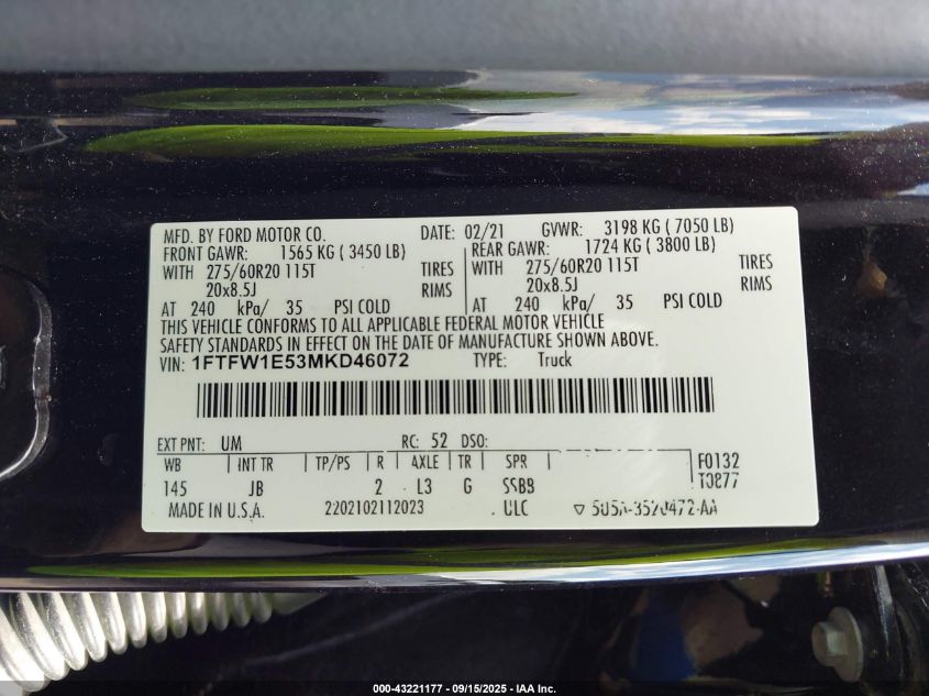 2021 FORD F-150 - 1FTFW1E53MKD46072, колір - Чорний, 5.0, Бензин, Повний привід із США