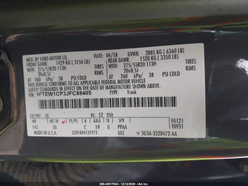 Колір СірийЦиліндри 6VIN 1FTEW1CP3JFC88405Стан СтаціонарноУшкодження Передня або задня