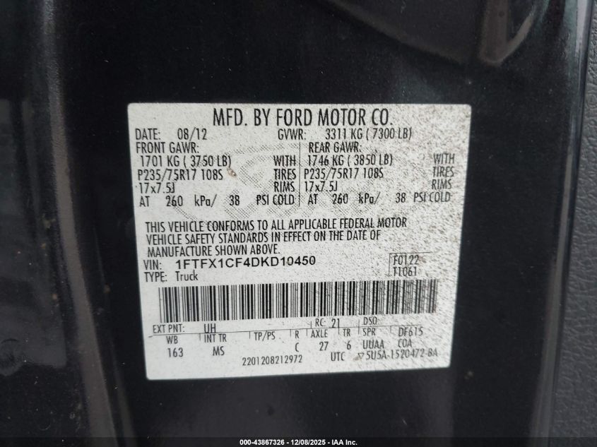 2013 FORD F-150 - 1FTFX1CF4DKD10450, колір - Чорний, 5.0, Бензин, із США