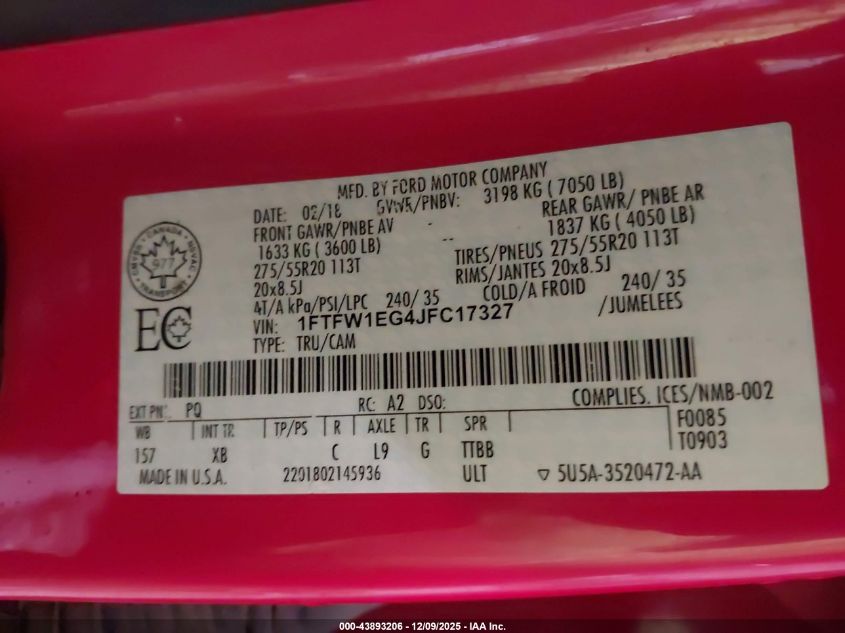 Колір ЧервонийЦиліндри 6Привід Повний привідVIN 1FTFW1EG4JFC17327Стан Заводиться та їде (перевірено)Ушкодження Передня або задня