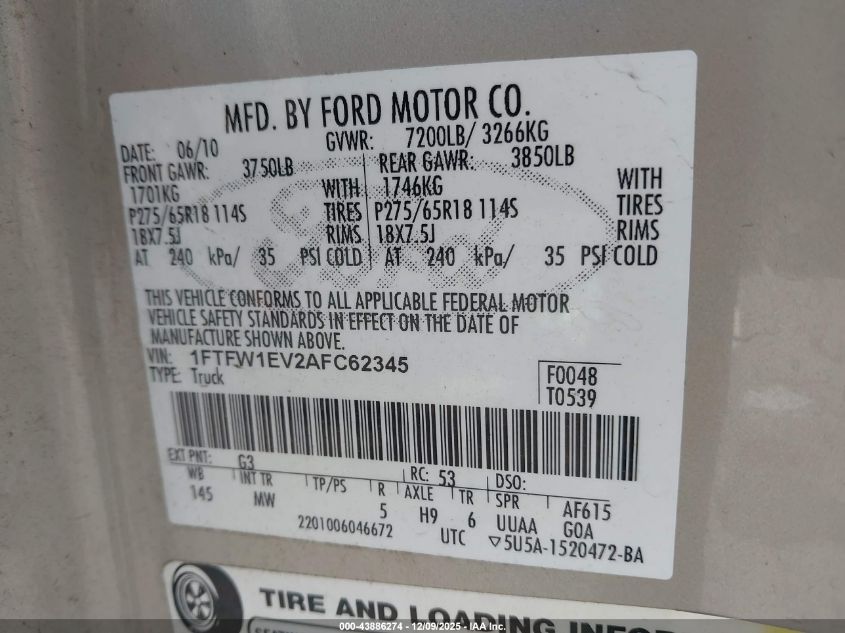 2010 FORD F-150 - 1FTFW1EV2AFC62345, колір - Бежевий, 5.4, Бензин, Повний привід із США