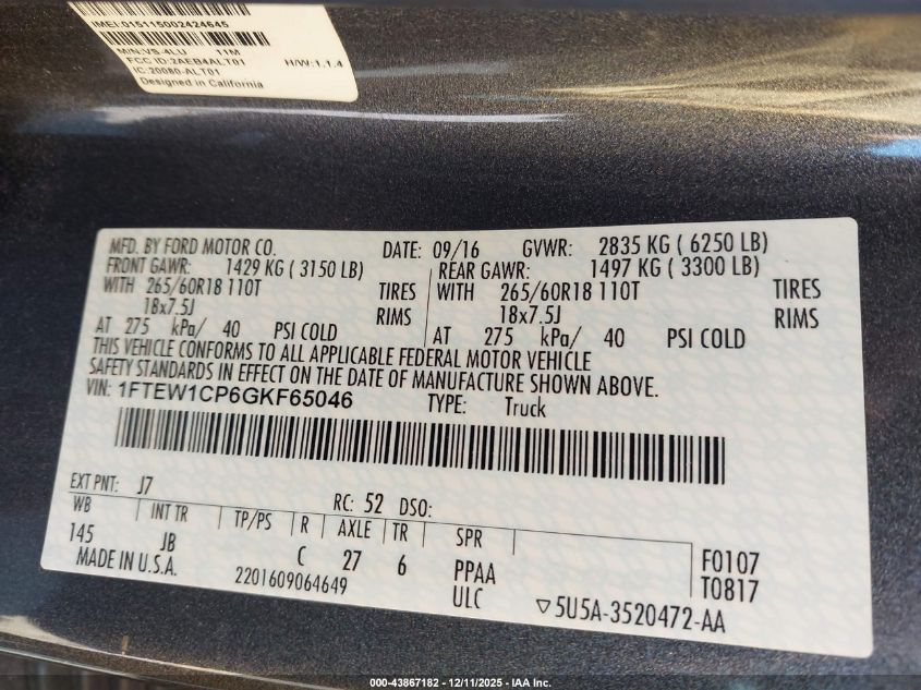 Колір СірийЦиліндри 6VIN 1FTEW1CP6GKF65046Стан СтаціонарноУшкодження Перекидання