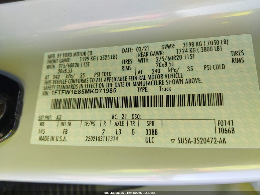 2021 FORD F-150 - 1FTFW1E85MKD71985, колір - Білий, 3.5, Бензин, Повний привід із США