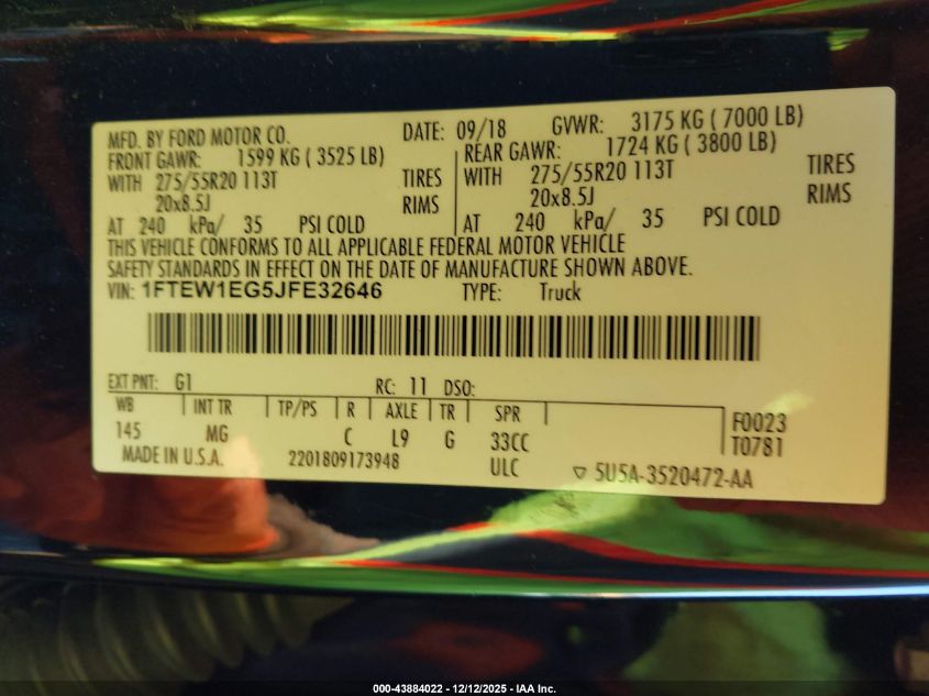 Колір ЧорнийЦиліндри 6Привід Повний привідVIN 1FTEW1EG5JFE32646Стан Заводиться та їде (перевірено)Ушкодження Ліва сторона