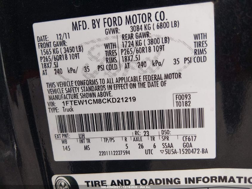 Колір ЧорнийЦиліндри 6VIN 1FTEW1CM8CKD21219Стан НевідомоУшкодження Звичайний знос