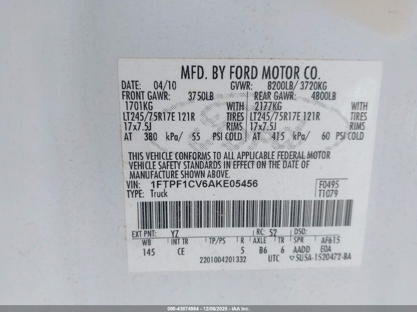 2010 FORD F-150 - 1FTPF1CV6AKE05456, колір - Білий, 5.4, Бензин, із США