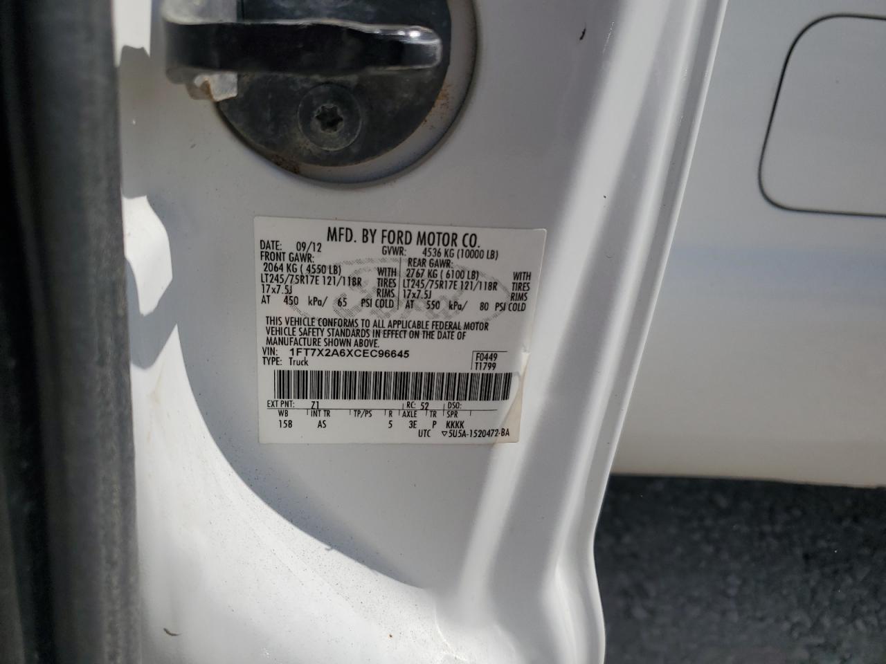 Колір БілийЦиліндри 8Привід Задній привідVIN 1FT7X2A6XCEC96645Стан НевідомоУшкодження Передня або задняДата аукціона 2025-10-07
