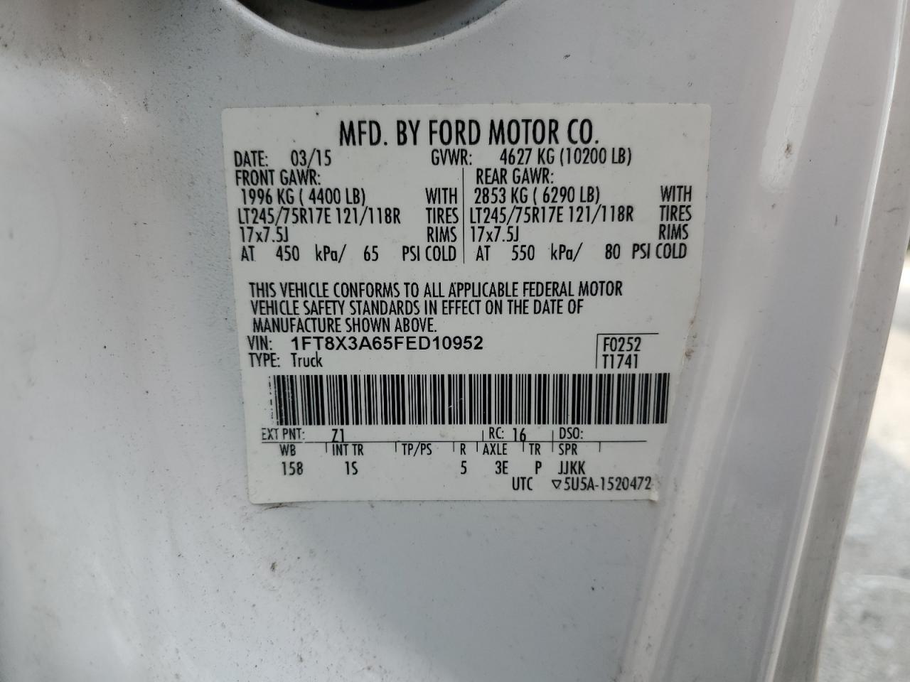 Колір БілийЦиліндри 8Привід Задній привідVIN 1FT8X3A65FED10952Стан Заводиться та їде (перевірено)Ушкодження Передня або задняДата аукціона 2025-10-07