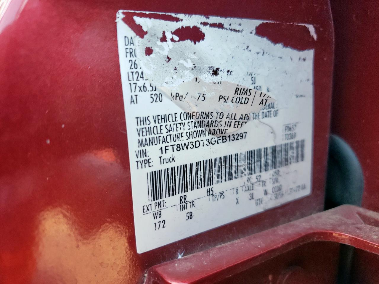 Колір БордовийЦиліндри 8Привід 4x4 з заднім приводомVIN 1FT8W3DT3GEB13297Стан НевідомоУшкодження НезначніДата аукціона 2025-10-13