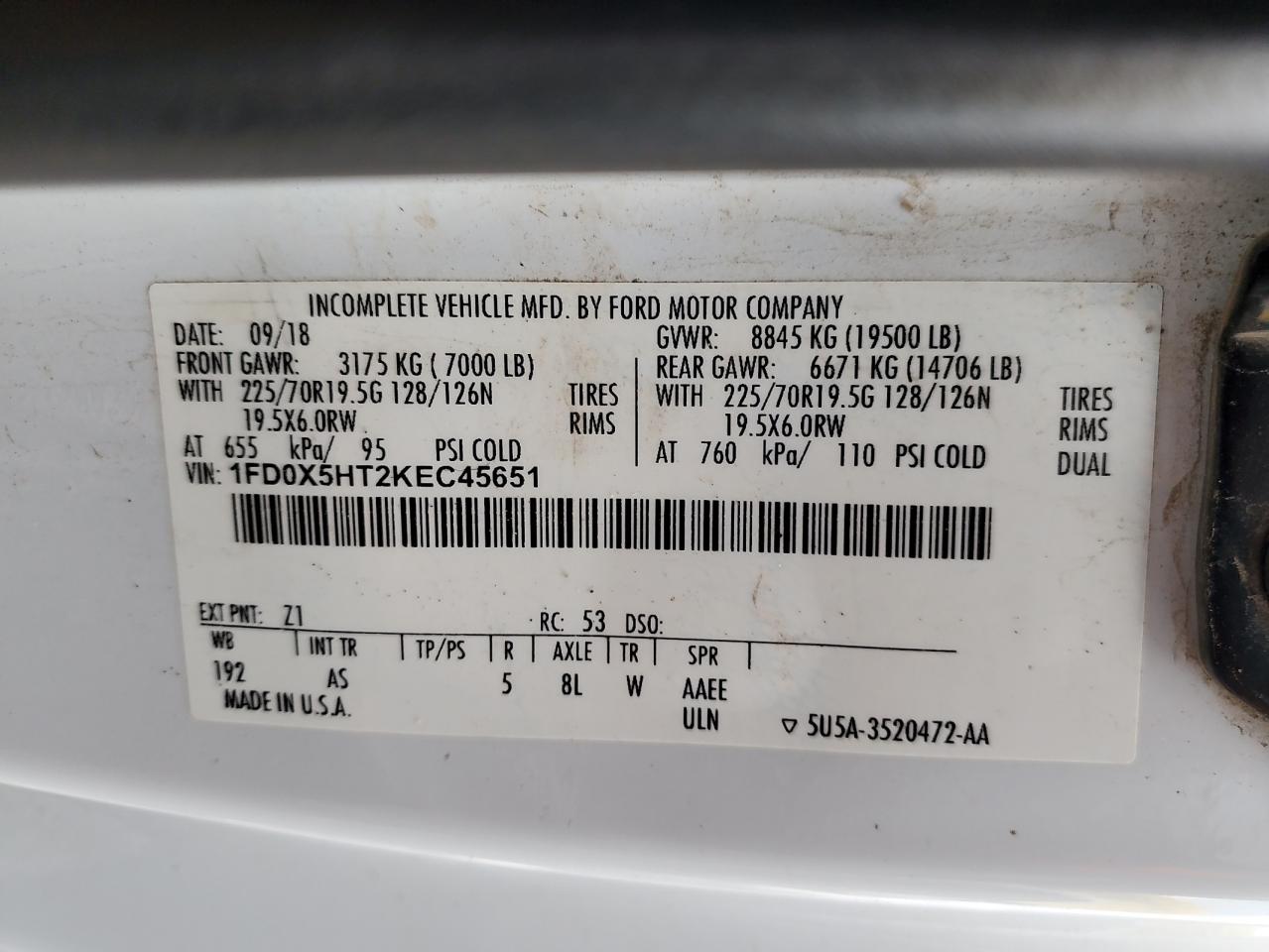 2019 FORD F-550 - 1FD0X5HT2KEC45651, колір - Білий, 6.7, Дизель, 4x4 з заднім приводом із США