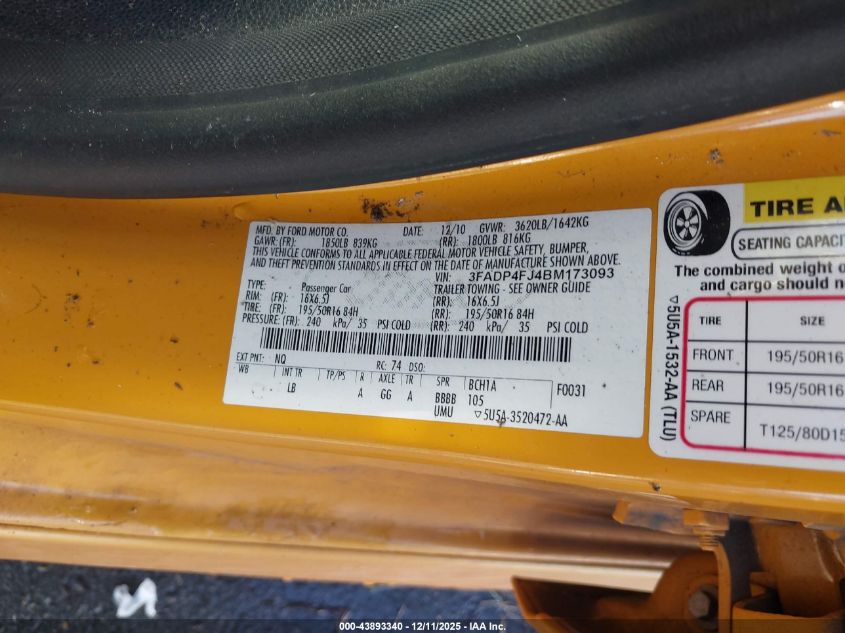 Колір ЖовтийЦиліндри 4Привід Передній привідVIN 3FADP4FJ4BM173093Стан СтаціонарноУшкодження Перекидання