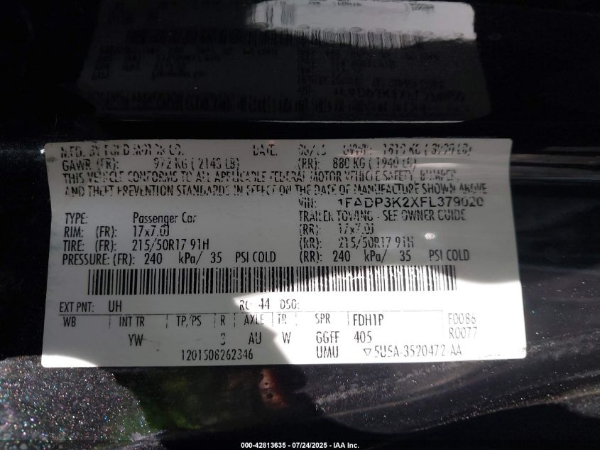 Колір ЧорнийЦиліндри 4Привід Передній привідVIN 1FADP3K2XFL379020Стан СтаціонарноУшкодження Передня або задня