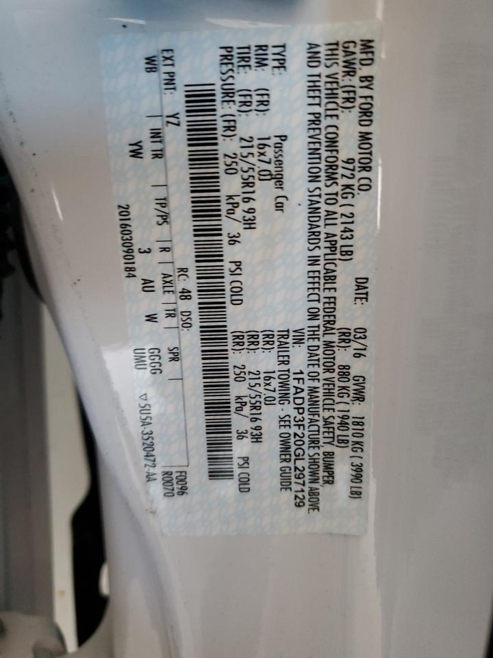 2016 FORD FOCUS - 1FADP3F20GL297129, колір - Білий, 2.0, Бензин, із США