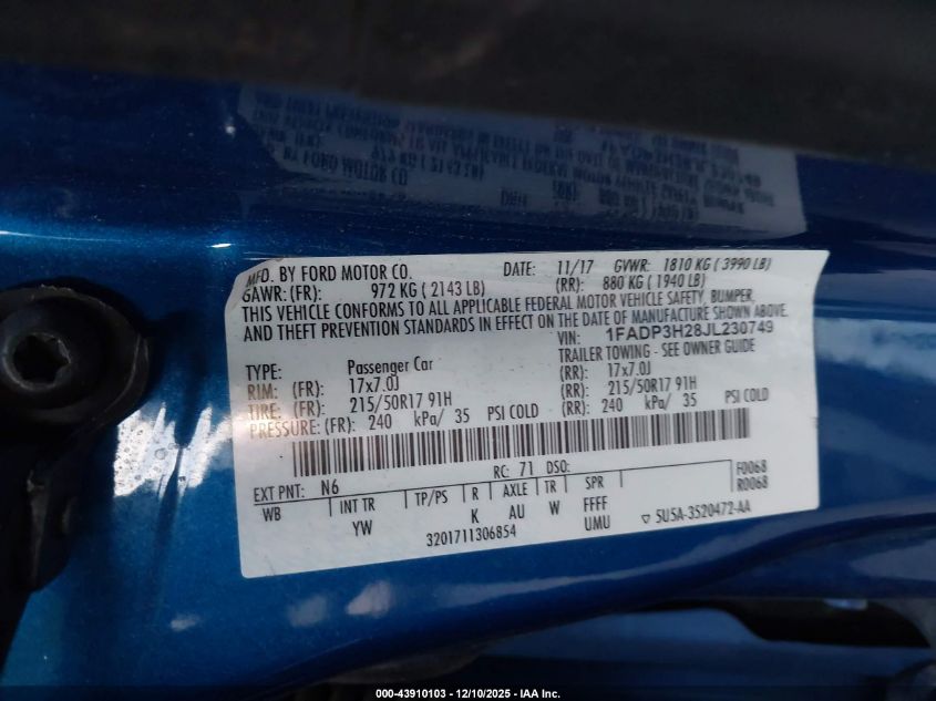 2018 FORD FOCUS - 1FADP3H28JL230749, колір - Синій, 2.0, Бензин, Передній привід із США