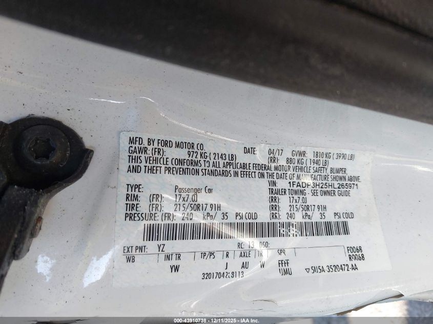2017 FORD FOCUS - 1FADP3H25HL265971, колір - Білий, 2.0, Бензин, Передній привід із США