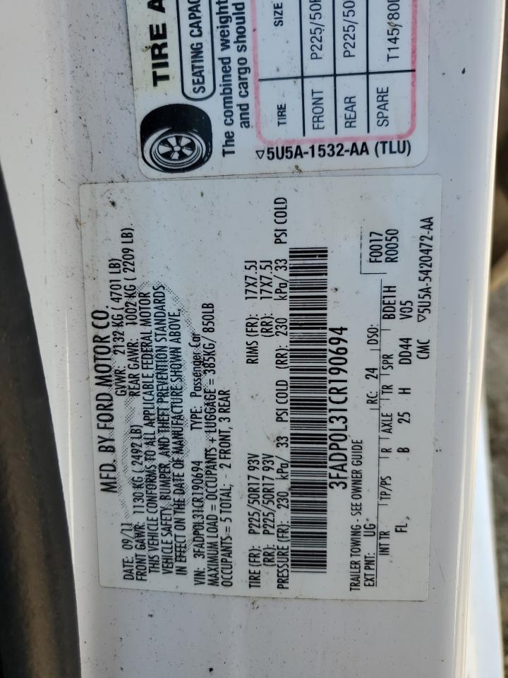 2012 FORD FUSION HYBRID - 3FADP0L31CR190694, колір - Білий, 2.5, Гібрид, із США