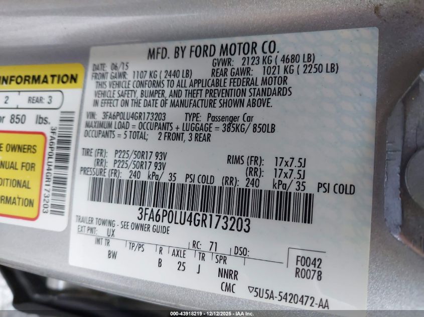 Колір СрібнийЦиліндри 4Привід Передній привідVIN 3FA6P0LU4GR173203Стан Заводиться та їде (перевірено)Ушкодження Задня