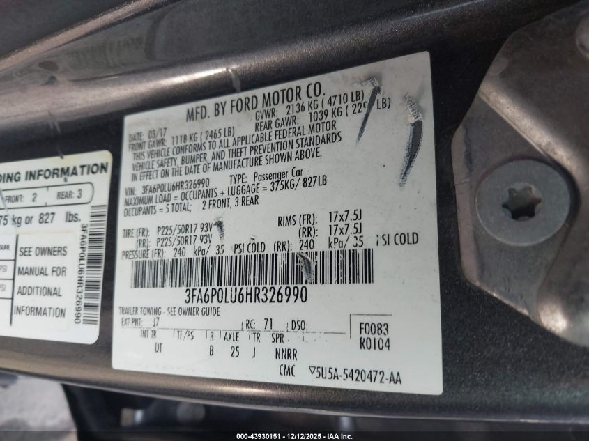 2017 FORD FUSION HYBRID - 3FA6P0LU6HR326990, колір - Чорний, 2.0, Гібрид, Передній привід із США