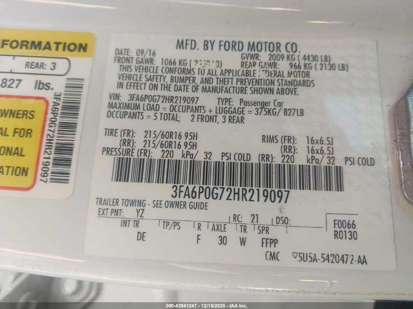 Колір БілийЦиліндри 4Привід Передній привідVIN 3FA6P0G72HR219097Стан НевідомоУшкодження Звичайний знос