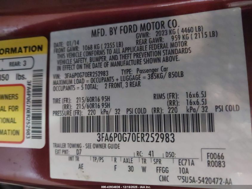 2014 FORD FUSION - 3FA6P0G70ER252983, колір - , 2.5, Бензин, Передній привід із США