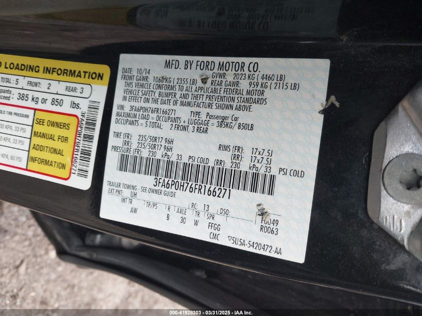 Колір ЧорнийЦиліндри 4Привід Передній привідVIN 3FA6P0H76FR166271Стан СтаціонарноУшкодження Передня або задня